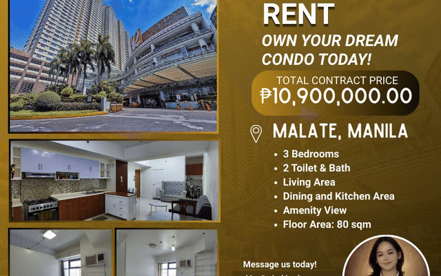 Condo Unit in Robinsons Place Manila Details: 3 Bedrooms 2 Toilet & Bath Living Area Dining and Kitchen Area Amenity View Floor Area: 80 sqm Price: 10,900,000.00 Nearby: St. Paul University De La Salle University Pedro Gil LRT Station Robinsons Place Ermita Manila Terms of Payment: 100K Reservation 30% Downpayment 70% Bank Financing